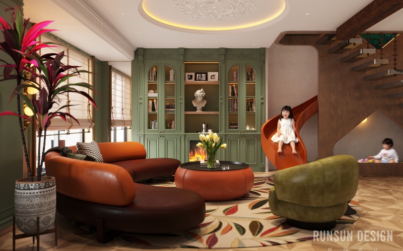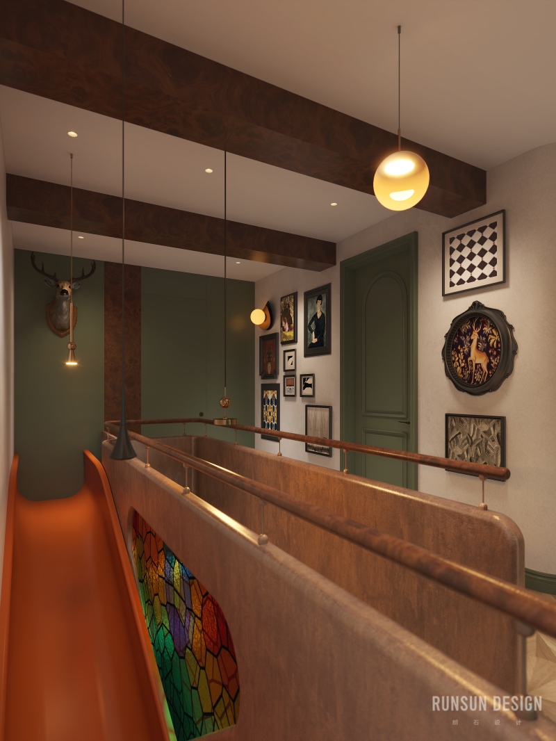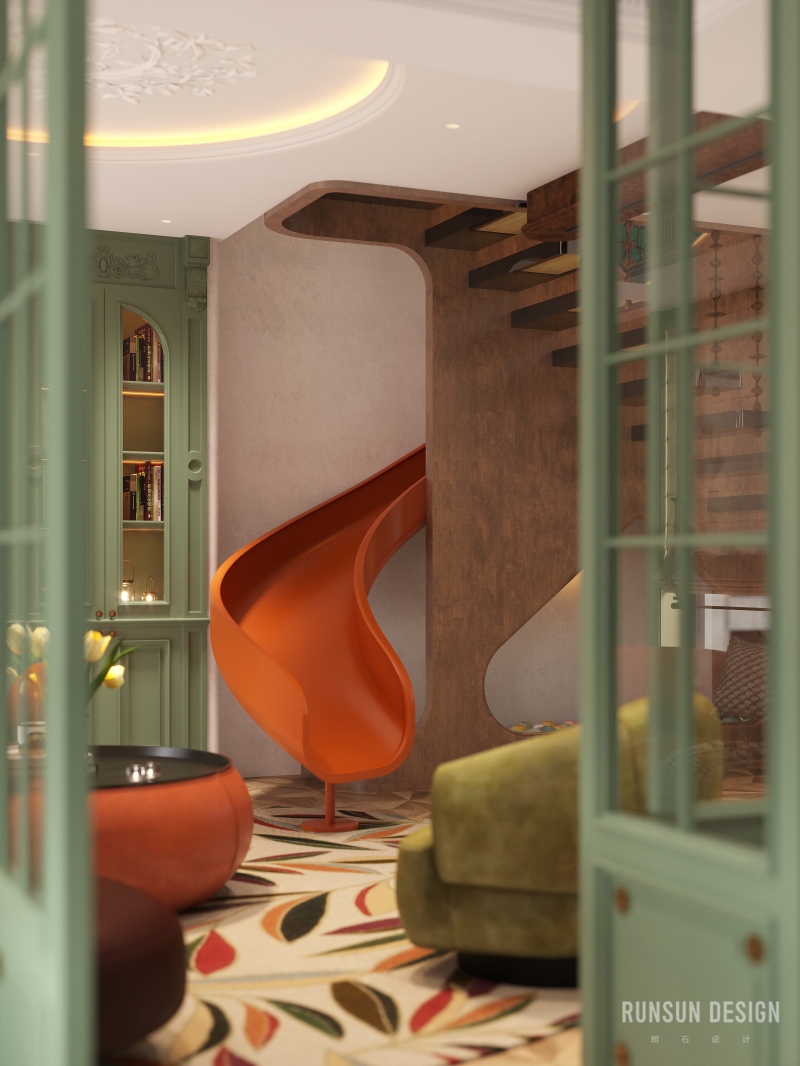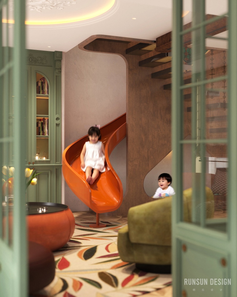 橙色滑梯自二樓盤旋而下