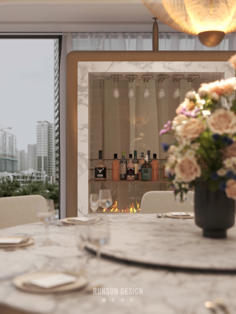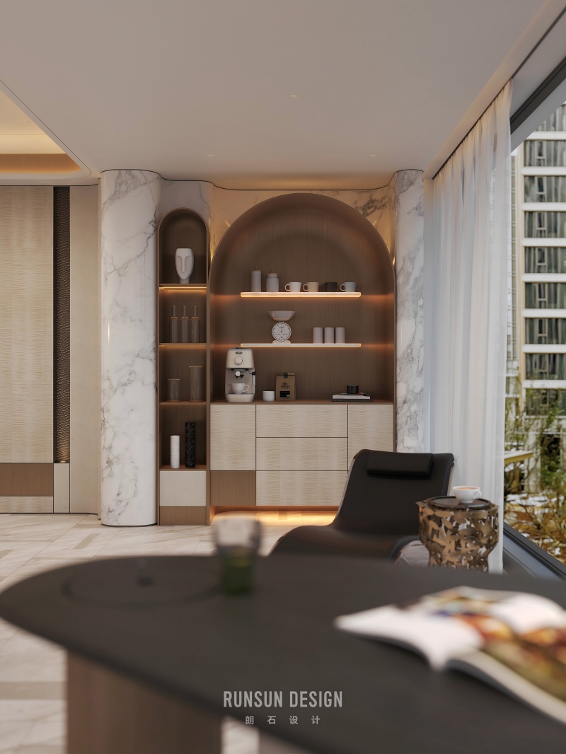 巨大的落地窗將都市天際線框成一幅流動(dòng)的巨幕